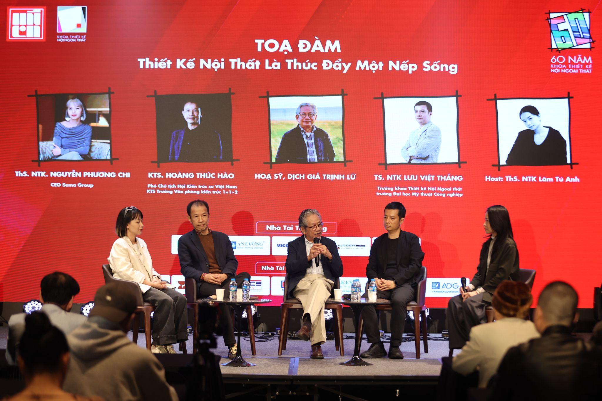 Điểm nhấn tiếp theo của chương trình là Tọa đàm chuyên đề với chủ đề “Thiết kế Nội thất là thúc đẩy một nếp sống”, quy tụ các chuyên gia hàng đầu trong lĩnh vực thiết kế và kiến trúc như Họa sĩ, Dịch giả Trịnh Lữ, KTS Hoàng Thúc Hào, NTK Lưu Việt Thắng và NTK Nguyễn Phương Chi, tọa đàm dưới sự dẫn dắt khéo léo của Host NTK Lâm Tú Anh đã chia sẻ và thảo luận về vai trò của thiết kế nội thất trong việc thúc đẩy nếp sống và cải thiện chất lượng sống của con người hiện đại.