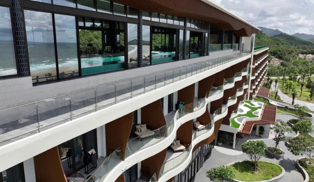 Hệ thống lan can kính tại khách sạn Angsana Quan Lạn (Quảng Ninh) sử dụng kính siêu trắng có độ thấu quang trên 91%, tối đa hóa kết nối thiên nhiên và tăng trải nghiệm thị giác cho du khách. Ảnh: Viglacera