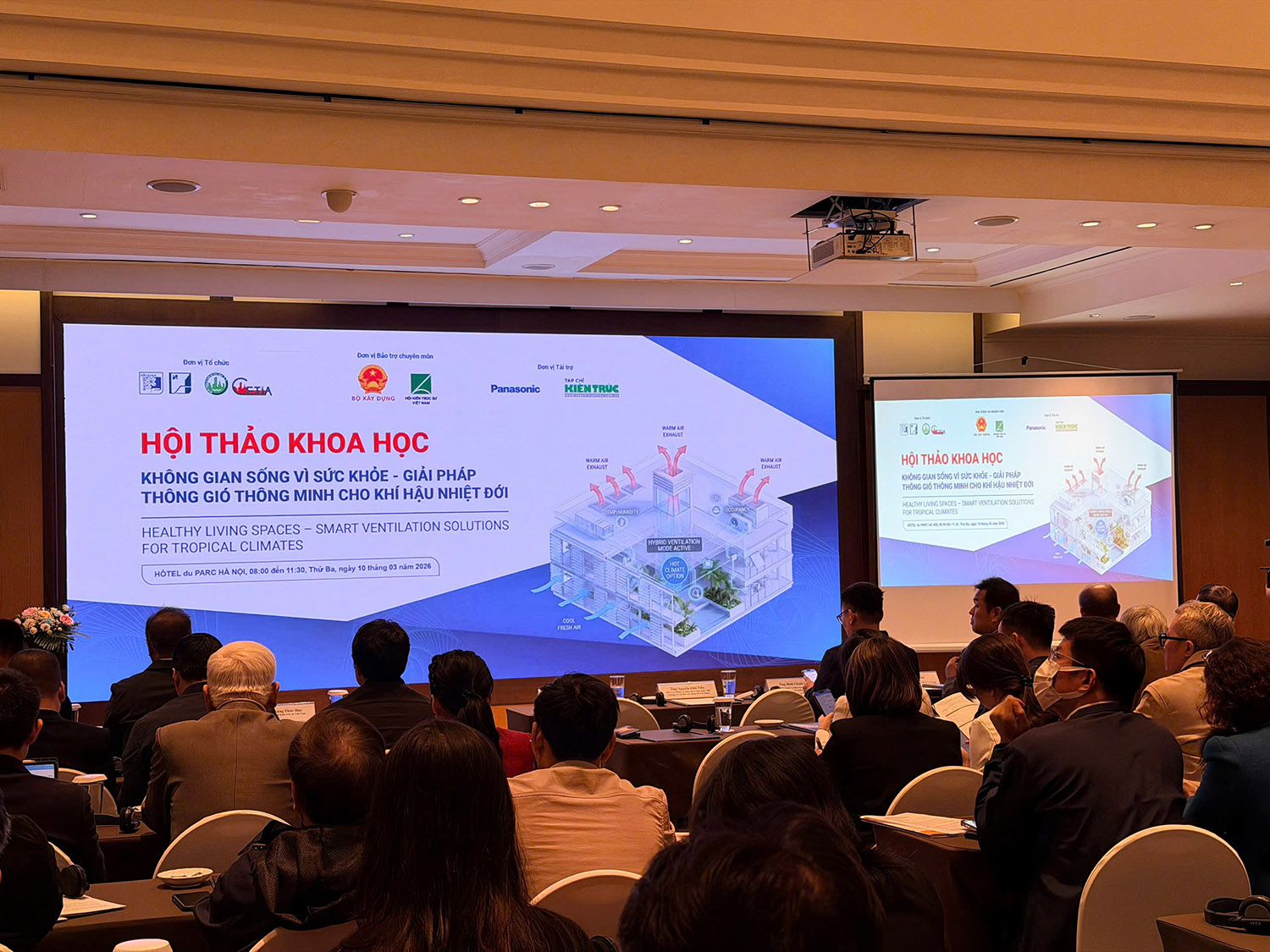 Trong phần tham luận chuyên môn, nhiều diễn giả đã chia sẻ các nghiên cứu và kinh nghiệm thực tiễn liên quan đến thiết kế thông gió cho công trình trong điều kiện khí hậu nhiệt đới. KTS Hoàng Thúc Hào, Phó Chủ tịch Hội Kiến trúc sư Việt Nam, cùng TS.KTS Phạm Khánh Toàn trình bày chủ đề “Hành trình phát triển của thông gió tự nhiên và thông gió cơ khí trong kiến trúc Việt Nam”, trong đó nhấn mạnh xu hướng kết hợp giữa thông gió tự nhiên và cơ khí (thông gió hybrid) nhằm đạt hiệu quả cao về vi khí hậu và tiết kiệm năng lượng. Các diễn giả cũng đưa ra nhiều ví dụ từ các công trình đạt Giải thưởng Kiến trúc Quốc gia trong những năm gần đây, từ nhà ở, khách sạn đến các công trình y tế, giáo dục và công cộng.