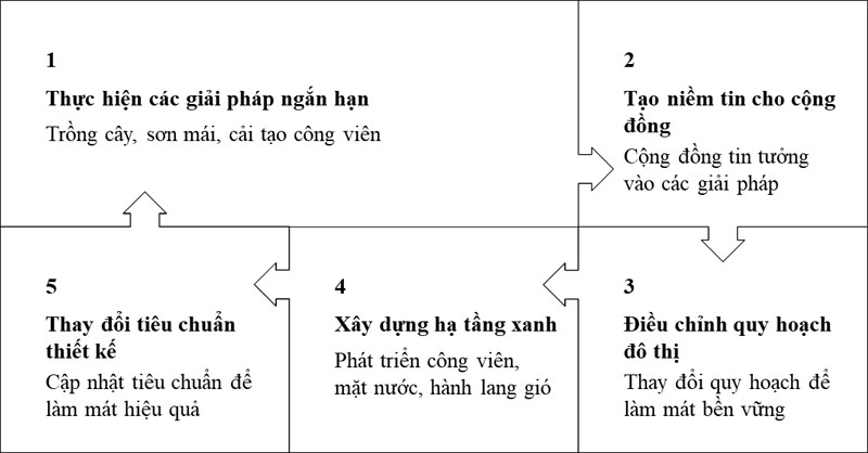 Lựa chọn giải pháp làm mát đô thị phải có tính chiến lược và dài hạn, do đó các thành phố nên xem xét đồng thời giải pháp ở cả cấp thành phố, khu vực và công trình để không bỏ sót khía cạnh nào. Tuy nhiên, trong ngắn hạn, nên ưu tiên các giải pháp dễ thực hiện như trồng cây, sơn mái, cải tạo công viên hiện có…với chi phí thấp, mang lại hiệu quả nhanh chóng, tạo niềm tin cho cộng đồng. Song song, vẫn phải chuẩn bị các giải pháp dài hạn như điều chỉnh quy hoạch đô thị, xây dựng hạ tầng xanh quy mô lớn, thay đổi tiêu chuẩn thiết kế – những việc cần thời gian và nguồn lực nhưng sẽ đem lại thay đổi bền vững. Bài học khác là cần lồng ghép các mục tiêu làm mát vào các kế hoạch phát triển liên quan (như kế hoạch tăng trưởng xanh, kế hoạch thích ứng biến đổi khí hậu) để tận dụng sự hỗ trợ chính sách sẵn có, tránh việc UCAP bị tách rời và khó thực thi. Hình 9 tổng kết các yếu tố then chốt để tạo nên sự thành công trong việc lồng ghép UCAP vào quá trình quy hoạch phát triển của địa phương.