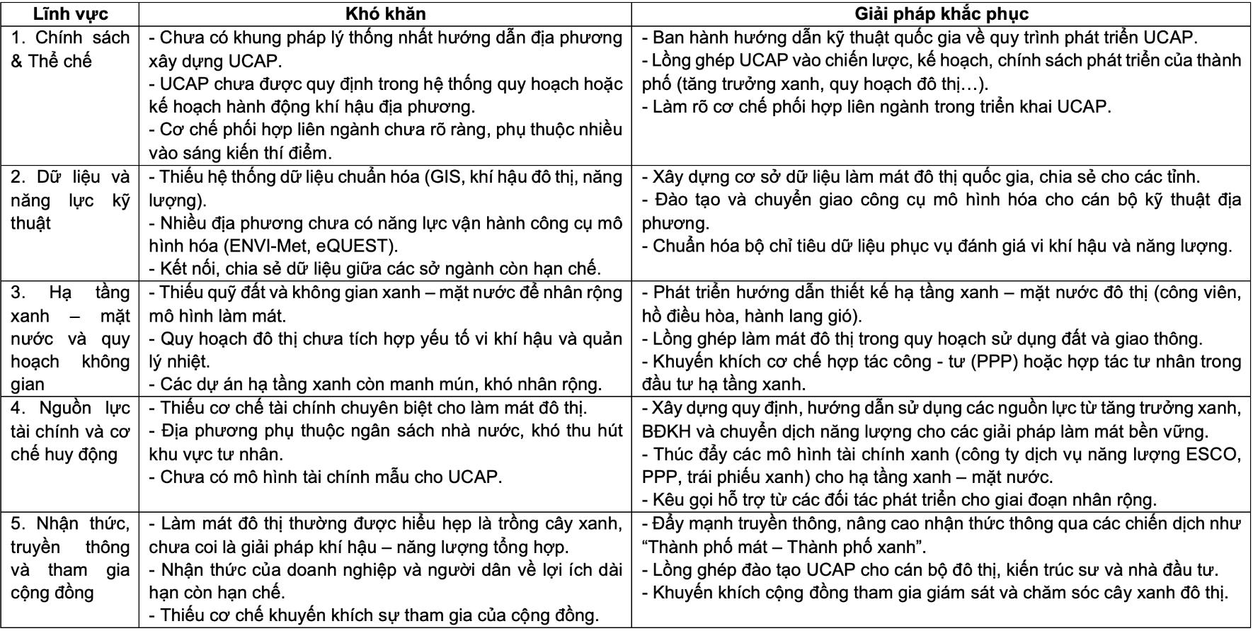 Bên cạnh những giá trị mang lại, việc lập UCAP tại các địa phương khác sẽ gặp những khó khăn, trở ngại tương tự như đối với Cần Thơ. Những kinh nghiệm trong việc khắc phục những vướng mắc này cần được tổng hợp và kế thừa khi lập UCAP cho các đô thị khác. Chi tiết về những khó khăn và giải pháp khắc phục được tổng hợp trong Bảng 2 dưới đây.