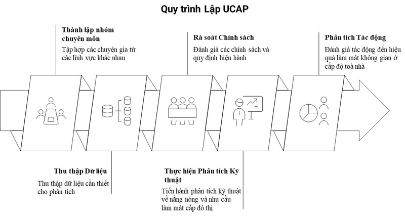 Trên cơ sở phân tích so sánh giữa các giai đoạn của quá trình lập UCAP, nghiên cứu xác định các bước cốt lõi, các yếu tố quyết định thành công và các thách thức trong triển khai. Các kết quả này được hệ thống thành một quy trình tổng quan, làm cơ sở đề xuất khung phương pháp lập kế hoạch làm mát đô thị bền vững có thể điều chỉnh linh hoạt theo điều kiện của từng đô thị. Quy trình này cũng sẽ được rà soát, đối sánh với các văn bản pháp lý hiện nay về quy hoạch, kiến trúc và hiệu quả năng lượng như Luật Quy hoạch, Luật Kiến trúc, Luật Tiết kiệm Năng lượng, các quy chuẩn, tiêu chuẩn về quy hoạch xây dựng như QCVN 01:2021/BXD, kiến trúc các loại hình công trình như QCVN 04:201/BXD, công trình xây dựng đạt hiệu quả năng lượng như QCVN 09:2017/BXD… Mục đích là để đảm bảo tính phù hợp, tương thích của quy trình lập UCAP đối với các quy định hiện có tại Việt Nam.