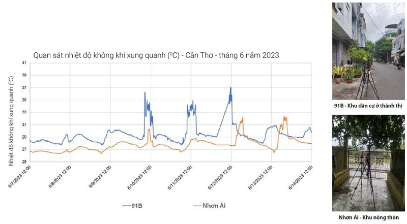 Quá trình và kết quả quan trắc nhiệt độ không khí tại điểm nóng (khu dân cư 91B) và điểm an toàn về nhiệt (xã Nhơn Ái) trong tháng 6/2023 tại TP Cần Thơ [2]