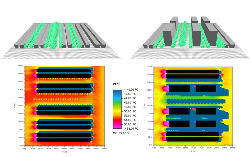 Kết quả mô phỏng nhiệt đô thị, thể hiện qua chỉ số nhiệt độ sinh lý tương đương PET cho thời điểm 15 giờ ngày 25/6/2023, trong hai kịch bản không gian đô thị tại TP Cần Thơ [2]