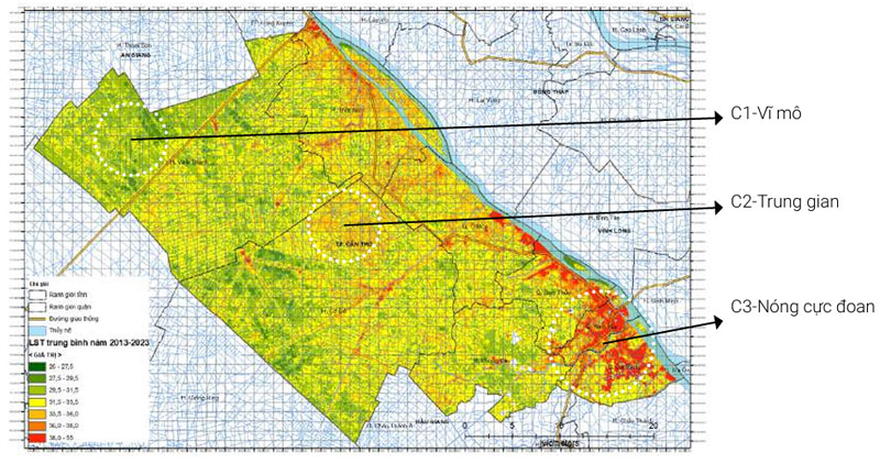 Bản đồ đảo nhiệt đô thị của TP Cần Thơ thể hiện qua phân bố nhiệt độ bề mặt trung bình trong giai đoạn 2013-2023, dựa trên ảnh vệ tinh LANDSAT [8] chụp lúc 10 giờ sáng với chu kỳ 16 ngày trong mùa khô (tháng 3 đến tháng 5)