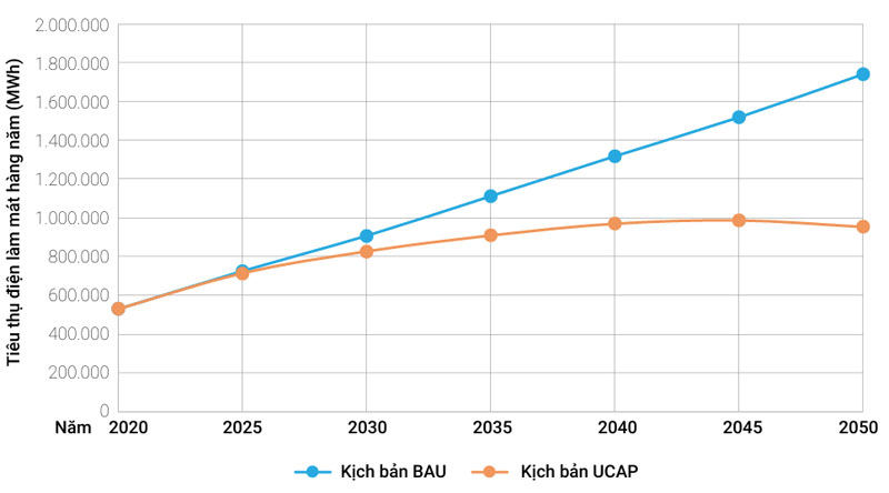 (1) Kịch bản thông thường (BAU): Xét đến tình trạng nhu cầu làm mát tăng cao do đô thị hóa, tăng trưởng dân số và thu nhập tăng. Tuy nhiên, ở kịch bản này, không có cải thiện hiệu suất năng lượng và không có chuyển đổi đáng kể sang công nghệ tiết kiệm năng lượng.