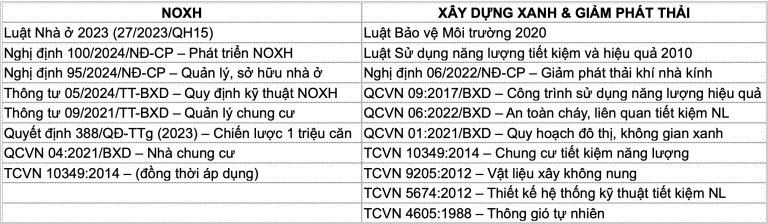 - Thiết kế phù hợp các Quy chuẩn và tiêu chuẩn hiện hành. Hiện nay, hệ thống văn bản pháp lý và tiêu chuẩn, quy chuẩn kỹ thuật liên quan đến NOXH và xanh – Giảm phát thải tại Việt Nam được tổng hợp lại trong bảng sau: