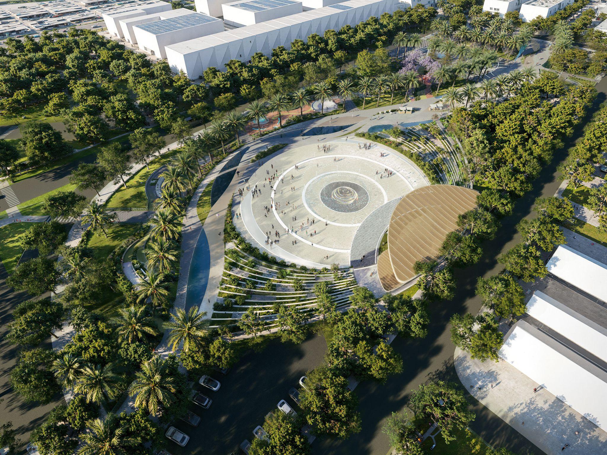 Điểm nhấn thị giác mạnh mẽ nhất chính là sân khấu trung tâm mang hình dáng vầng trăng khuyết, đồng thời gợi nhắc đến hình ảnh chiếc lá vươn lên từ lòng đất. Trục quảng trường được thiết kế như một quỹ đạo ánh sáng, định hướng tầm nhìn thẳng ra đại dương. Tại đây, hệ mặt nước phản chiếu không chỉ đóng vai trò thẩm mỹ, làm lung linh thêm “vầng trăng” vào ban đêm, mà còn là trái tim điều hòa khí hậu cho toàn bộ khu vực.