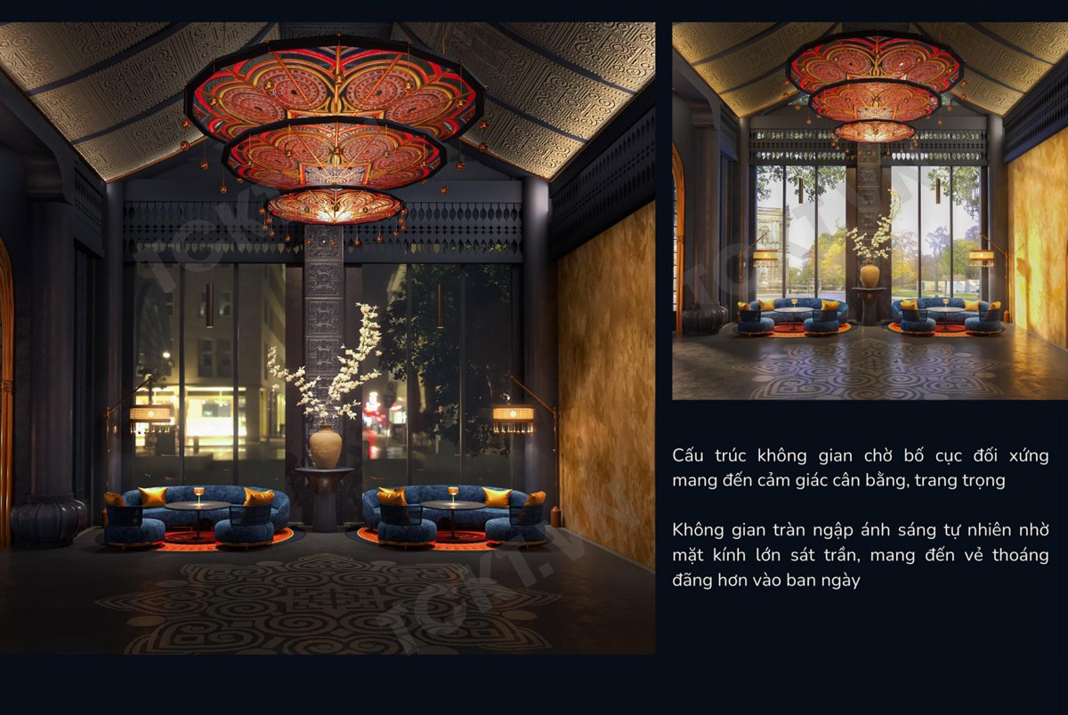 Sảnh “Khởi nguyện” (450m²): Lấy cảm hứng từ khoảnh khắc mở đầu lễ hội tại nhà gia chủ. Gam màu chàm và đất nung kết hợp vòm cong, phù điêu hoa văn, ánh sáng vàng ấm cùng cụm đèn treo cách điệu từ điệu múa ô truyền thống, tạo nên bầu không khí trang nghiêm và huyền bí.
