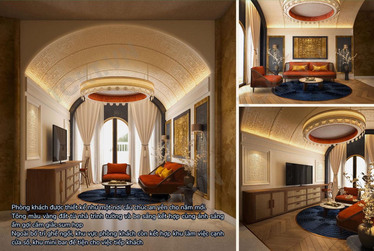 Phòng ngủ “Lời nguyện bình an” (80m²): Không gian lấy cảm hứng từ thời điểm khép lại mùa lễ hội trong sự tĩnh lặng và linh thiêng, gửi gắm lời cảm tạ và cầu chúc an lành. Tông vàng đất và cam đất gợi hơi ấm bếp lửa, hướng đến sự sum họp và bình yên.