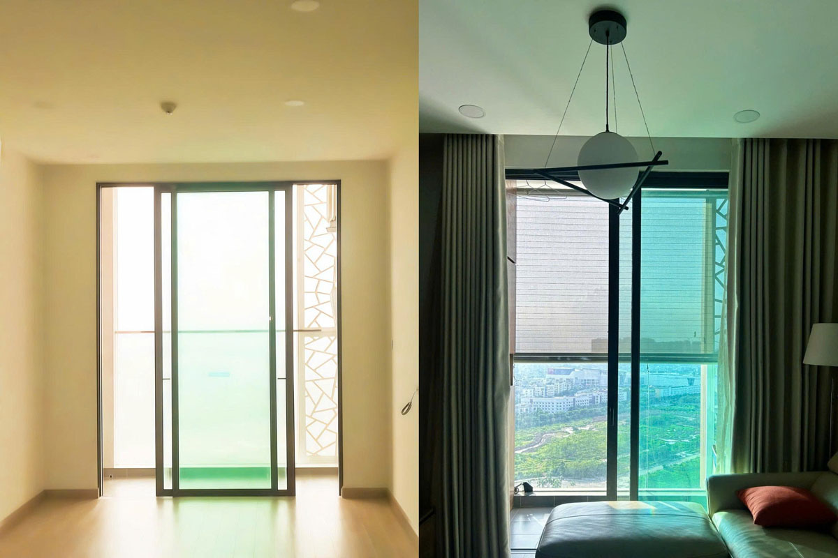 Hình 4. Sau khi lắp 2 lớp rèm, nhiệt độ khu vực logia và phòng khách giảm khoảng 3°C, lượng bụi mịn vào phòng giảm 20–25%, cảm giác nóng bức và bụi bẩn đều giảm rõ rệt so với trước. Nguồn: Nhóm tác giả