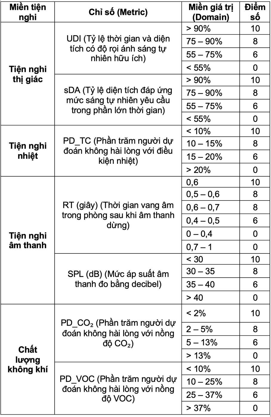 Bảng 1: Các yếu tố tiện nghi và chỉ số đại diện cùng điểm hiệu suất. Nguồn: Fathi & O’Brien (2023), Dịch: Nhóm Tác giả