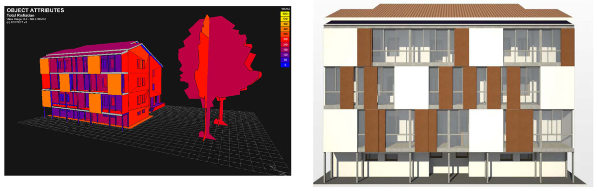 Thử nghiệm và so sánh nhanh các phương án thiết kế thụ động với các kịch bản được điều chỉnh trực tiếp trên mô hình, cho phép lựa chọn giải pháp tối ưu trước khi triển khai, từ đó giảm rủi ro, tiết kiệm chi phí và nâng cao chất lượng môi trường sống. Các giải pháp trong trường hợp này được bao gồm: Thiết kế hệ thống che nắng chủ động và thụ động nhằm hạn chế bức xạ nhiệt; tăng cường thông gió tự nhiên và thông gió xuyên phòng; sử dụng vật liệu phù hợp và trồng cây tại các không gian đệm như hiên, logia nhằm giảm tác động trực tiếp của thời tiết.
